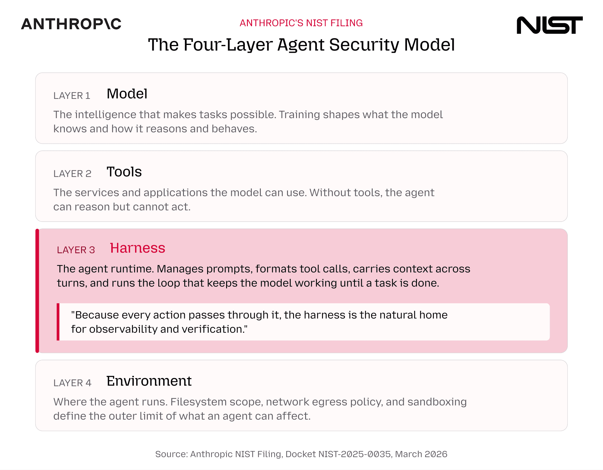 Anthropic's four-layer model for agent security, published in a formal NIST filing, identifies the agent runtime (the harness) as the natural home for observability and verification. Six NIST standards each independently scope out non-adversarial agent harm.