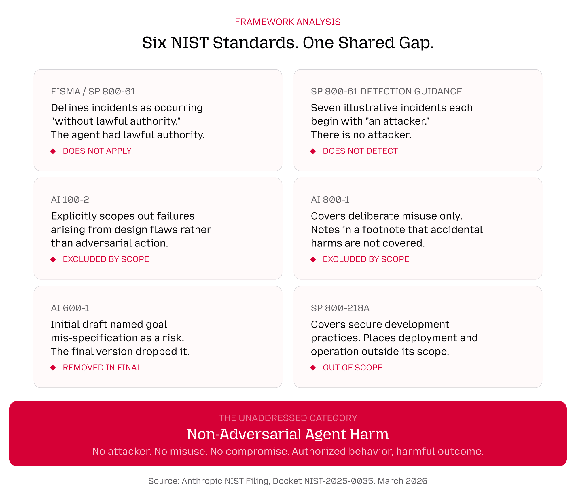 We call this non-adversarial agent harm. The AI safety community would recognize it as an alignment problem, the classic paperclip maximizer playing out in production. And as the filing demonstrates, six current NIST standards each independently scope it out.